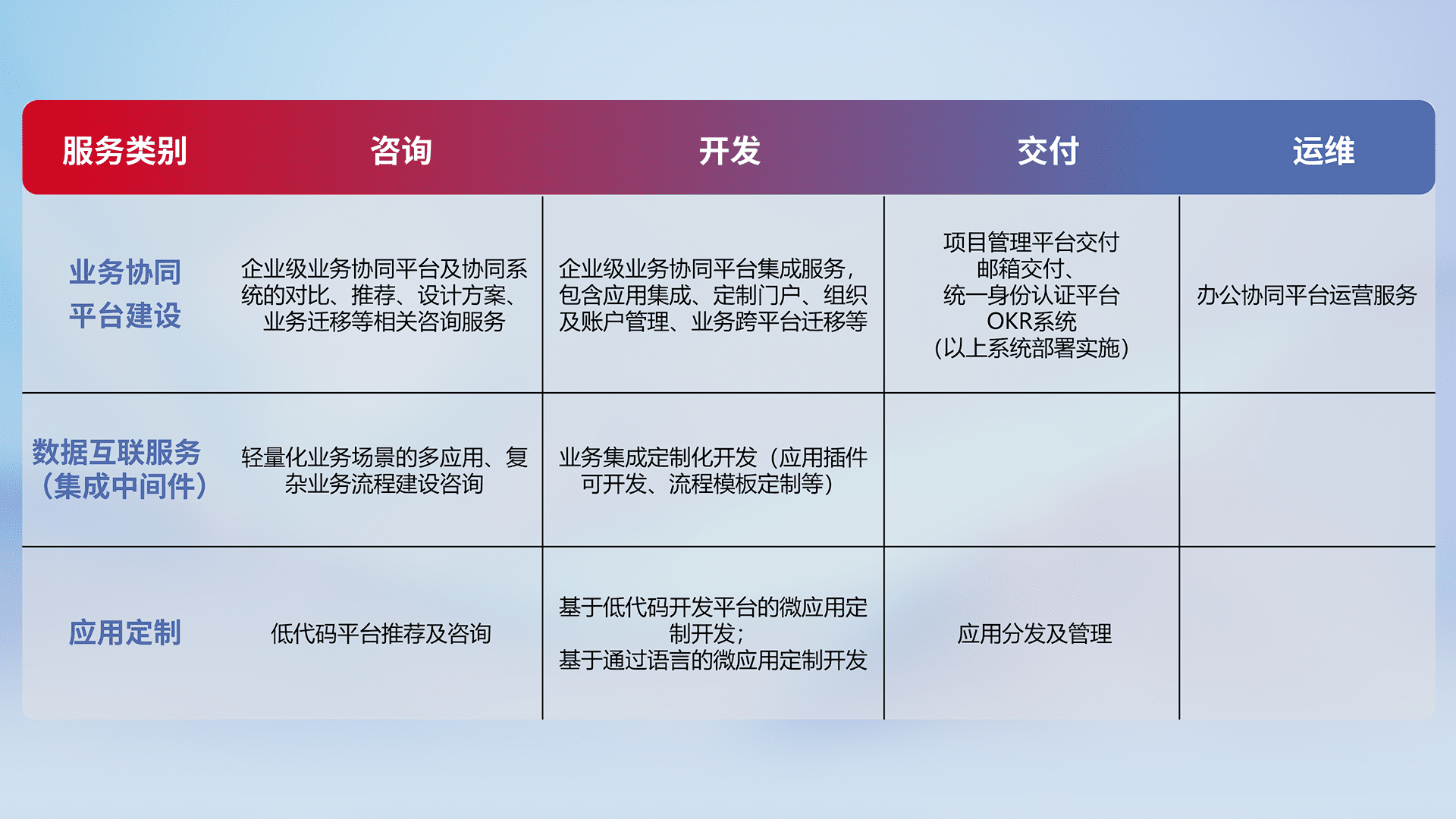 针对钉钉、、企微、、、IDaas等平台级产品提供产品的规划、、方案、、、、交付、、、、定制化开发等服务,,,实现如统一协同办公、、、、智能客户服务、、、混合会议管理、、、智能数据查询、、、等业务场景,,,,实现数字化转型。。。